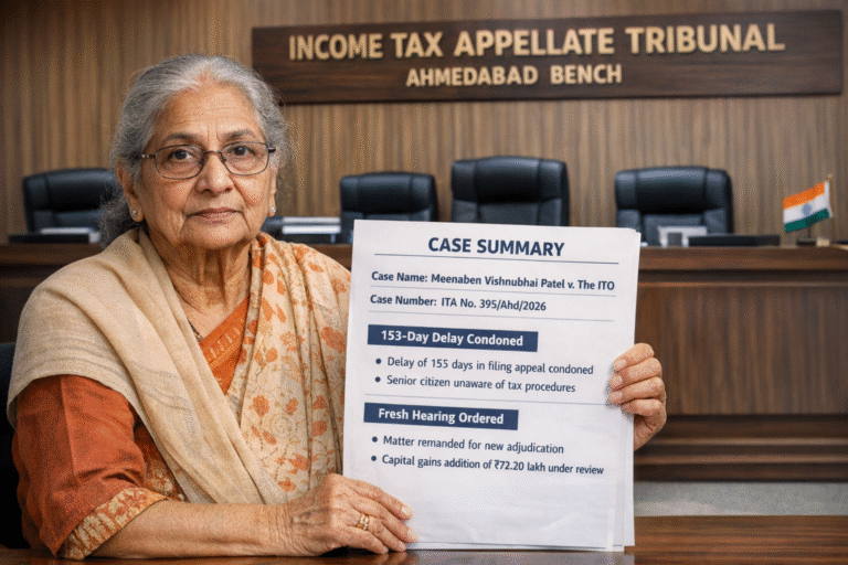 In a significant and compassionate ruling, the Income Tax Appellate Tribunal (ITAT), Ahmedabad Bench, has condoned a delay of 153 days in filing an appeal by a senior citizen taxpayer, recognizing her lack of familiarity with tax procedures and digital …