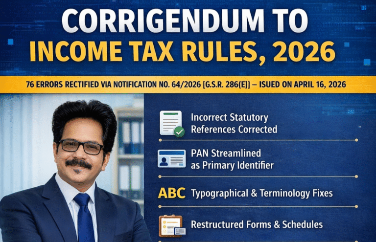 In a significant development for taxpayers and professionals, the Central Board of Direct Taxes (CBDT) has released a crucial corrigendum to the newly notified Income Tax Rules, 2026. Issued through Notification No. 64/2026 [G.S.R. 286(E)] dated April 16, 2026, the corrigendum addresses and rectifies 76 errors identified in the rules. These corrections are aimed at improving technical accuracy, eliminating inconsistencies, and ensuring seamless implementation of the Income Tax Act, 2025.