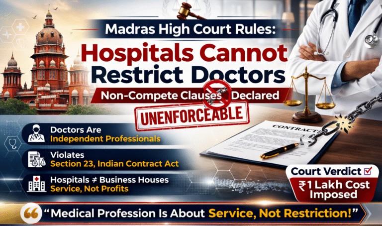 In a landmark ruling, the Madras High Court has held that private hospitals cannot treat doctors like factory workmen by imposing restrictive non-compete and non-solicitation clauses in professional agreements. The Court emphasized that hospitals are service-oriented institutions and cannot function as profit-driven corporate entities that restrict a doctor’s professional freedom.