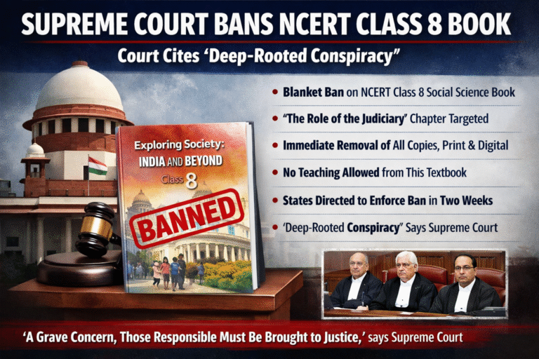 In a significant development on February 26, 2026, the Supreme Court of India ordered a blanket ban on a Class 8 Social Science textbook published by National Council of Educational Research and Training (NCERT). The book, titled Exploring Society: India and Beyond, has come under judicial scrutiny for allegedly containing content relating to “corruption in the judiciary.”